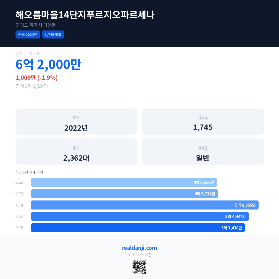 해오름마을14단지푸르지오파르세나 최근 거래가는 6억 2,000만입니다. (2026-04)