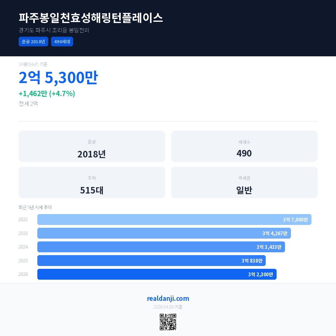 파주봉일천효성해링턴플레이스 국민평형 기준 2026년 평균 거래가는 3억 2,300만으로, 전년 대비 4.7% 상승 했습니다.