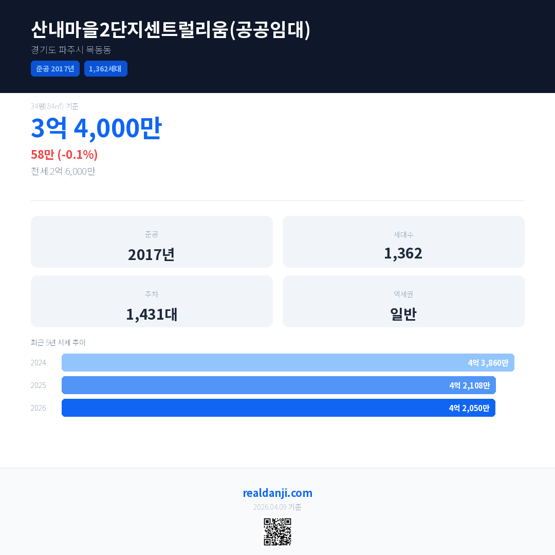 산내마을2단지센트럴리움(공공임대) 국민평형 기준 2026년 평균 거래가는 4억 2,050만으로, 전년 대비 0.1% 하락 했습니다.