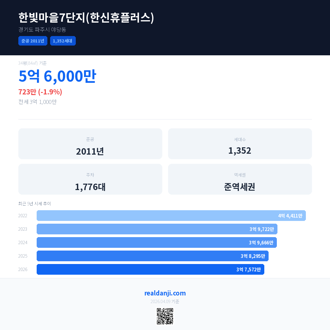 한빛마을7단지(한신휴플러스) 최근 거래가는 5억 6,000만입니다. (2026-04)