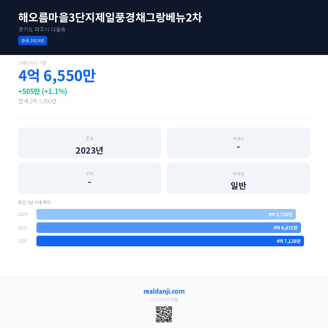 해오름마을3단지제일풍경채그랑베뉴2차 국민평형 기준 2026년 평균 거래가는 4억 7,138만으로, 전년 대비 1.1% 상승 했습니다.