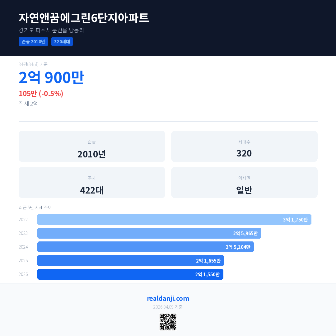 자연앤꿈에그린6단지아파트 국민평형 기준 2026년 평균 거래가는 2억 1,550만으로, 전년 대비 0.5% 하락 했습니다.