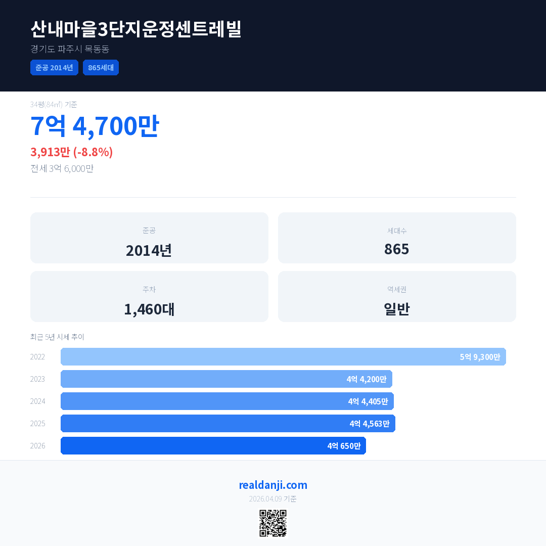 산내마을3단지운정센트레빌 국민평형 기준 2026년 평균 거래가는 4억 650만으로, 전년 대비 8.8% 하락 했습니다.