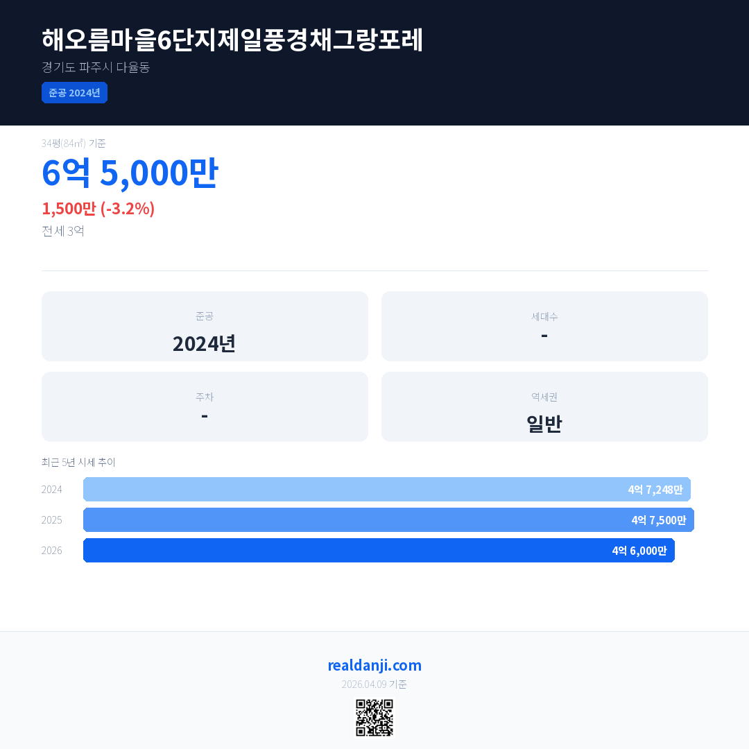 해오름마을6단지제일풍경채그랑포레 국민평형 기준 2026년 평균 거래가는 4억 6,000만으로, 전년 대비 3.2% 하락 했습니다.
