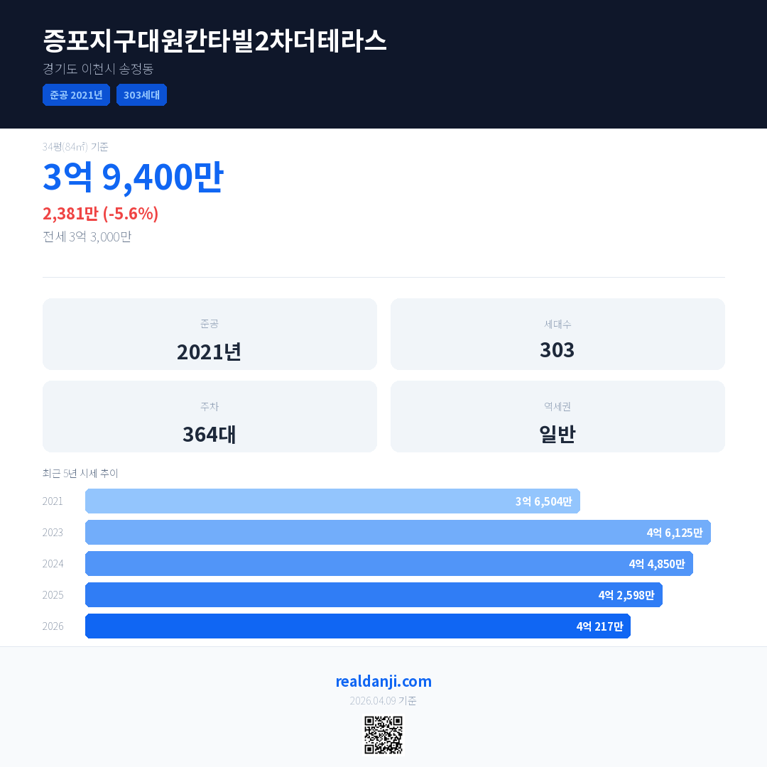 증포지구대원칸타빌2차더테라스 국민평형 기준 2026년 평균 거래가는 4억 160만으로, 전년 대비 5.7% 하락 했습니다.