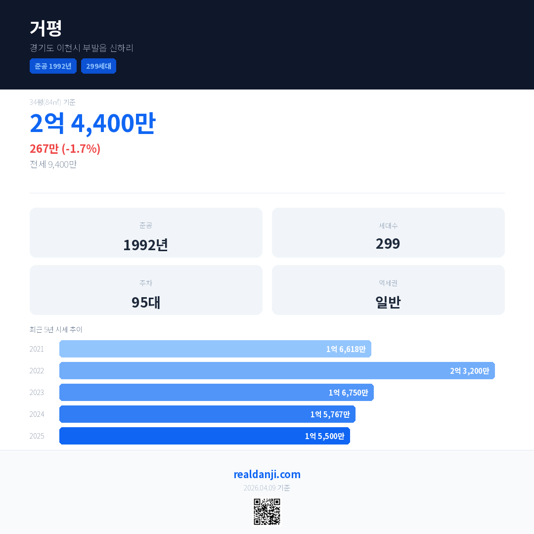 거평 국민평형 기준 2025년 평균 거래가는 1억 5,500만으로, 전년 대비 1.7% 하락 했습니다.