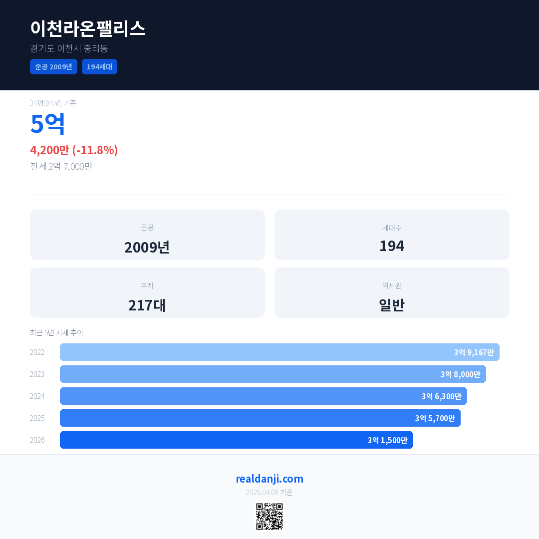 이천라온팰리스 최근 거래가는 5억입니다. (2026-02)