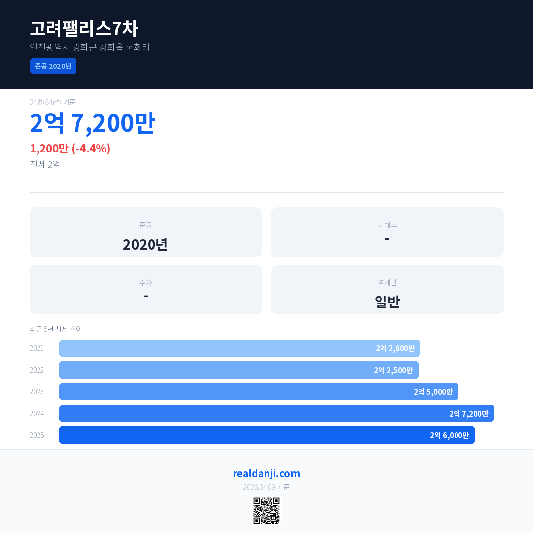 고려팰리스7차 국민평형 기준 2025년 평균 거래가는 2억 6,000만으로, 전년 대비 4.4% 하락 했습니다.