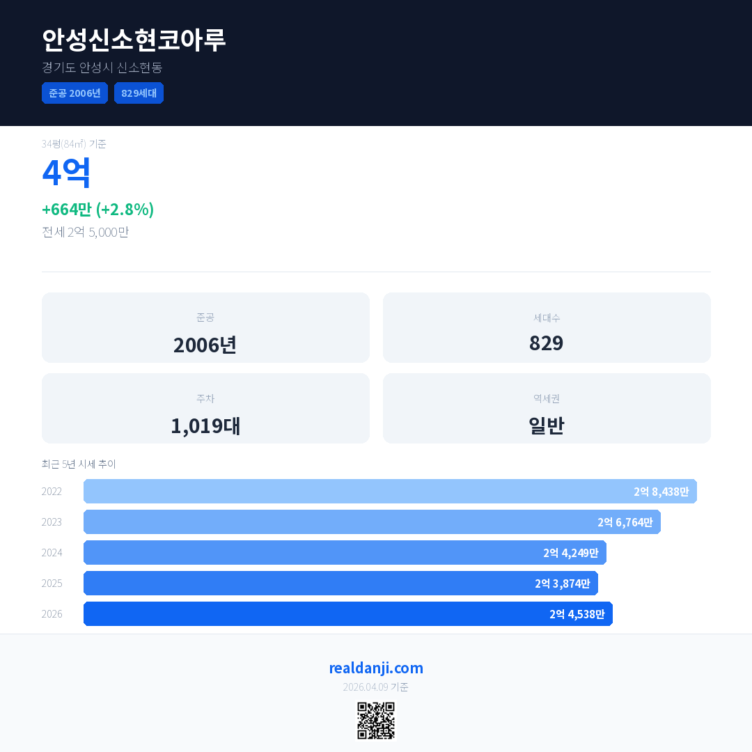 안성신소현코아루 국민평형 기준 2026년 평균 거래가는 2억 4,538만으로, 전년 대비 2.8% 상승 했습니다.