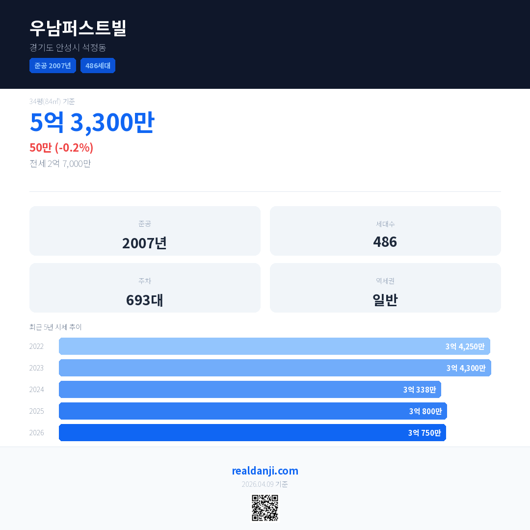 우남퍼스트빌 국민평형 기준 2026년 평균 거래가는 3억 750만으로, 전년 대비 0.2% 하락 했습니다.