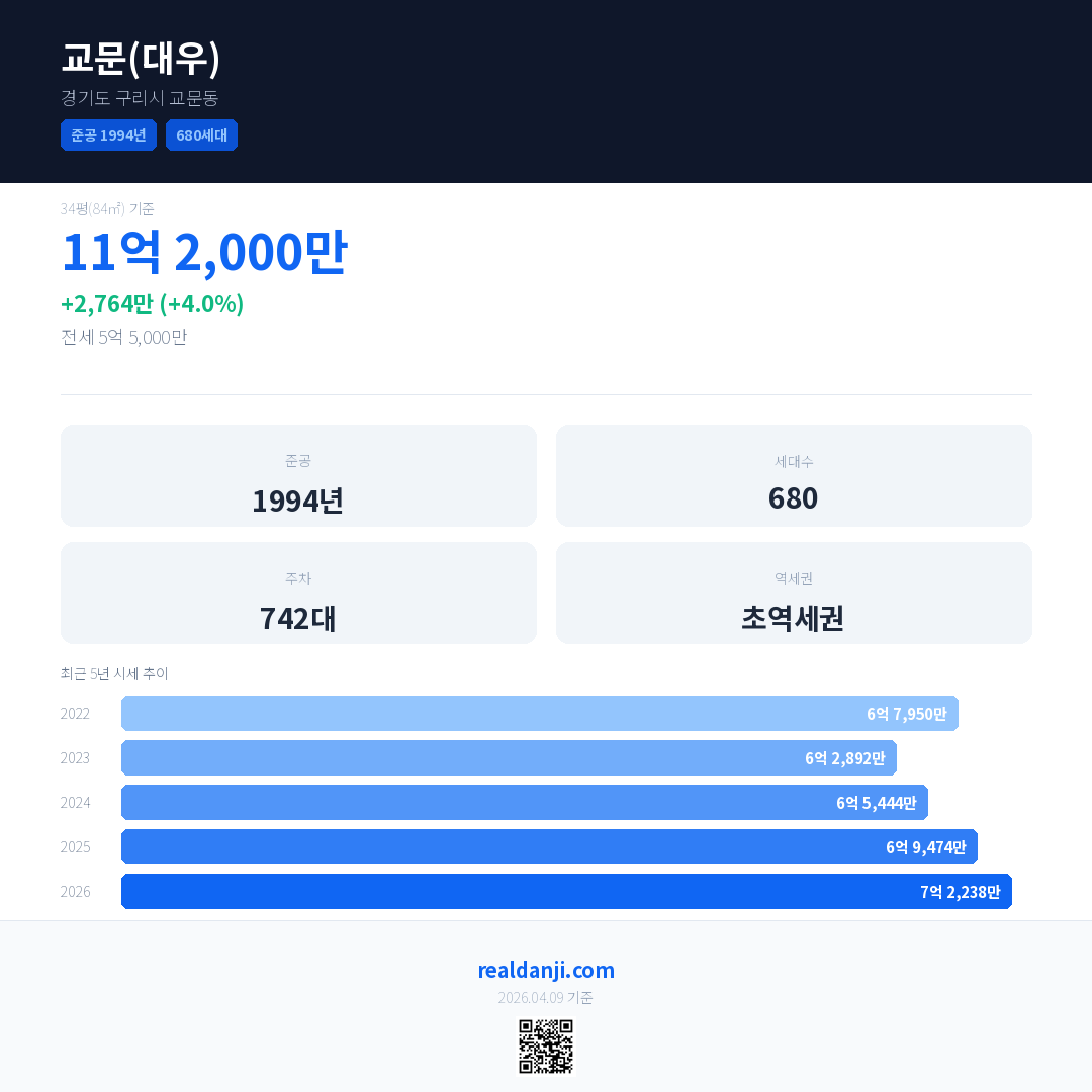 교문(대우) 국민평형 기준 2026년 평균 거래가는 7억 2,238만으로, 전년 대비 4.0% 상승 했습니다.