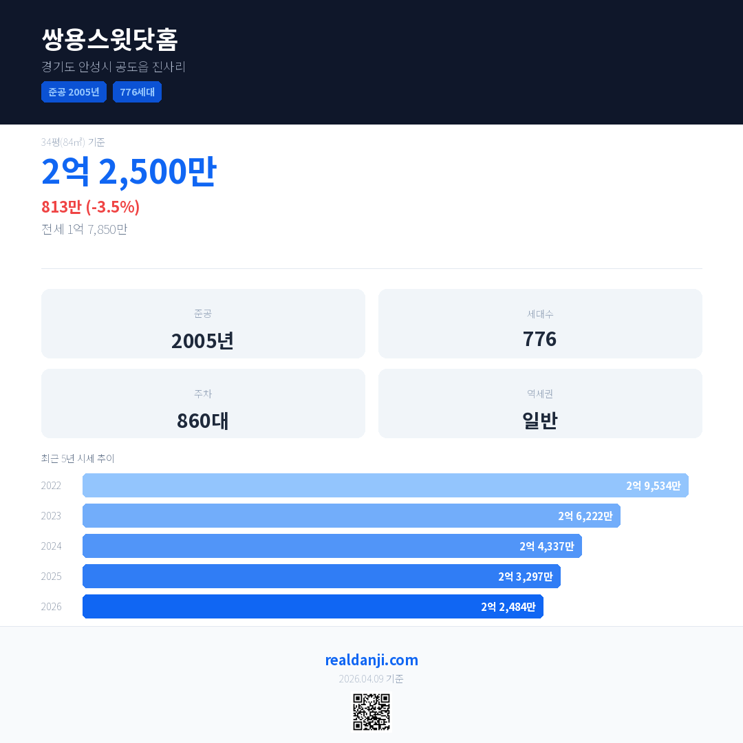 쌍용스윗닷홈 국민평형 기준 2026년 평균 거래가는 2억 2,484만으로, 전년 대비 3.5% 하락 했습니다.