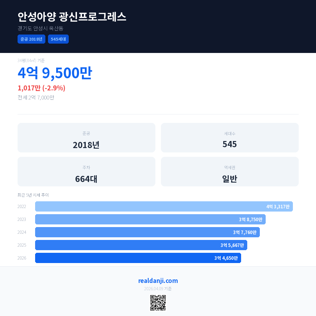 안성아양 광신프로그레스 국민평형 기준 2026년 평균 거래가는 3억 4,650만으로, 전년 대비 2.9% 하락 했습니다.