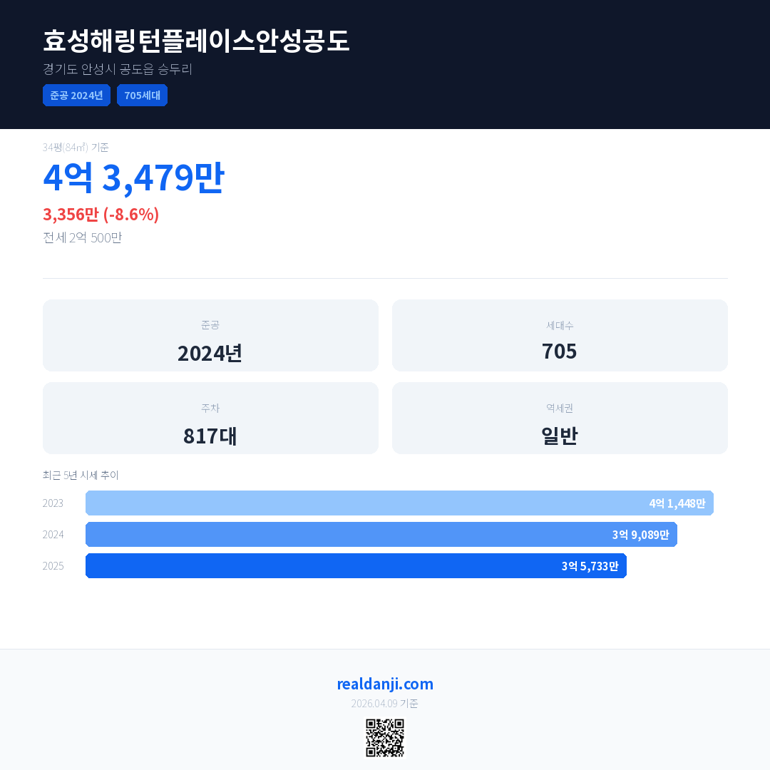 효성해링턴플레이스안성공도 국민평형 기준 2025년 평균 거래가는 3억 5,733만으로, 전년 대비 8.6% 하락 했습니다.