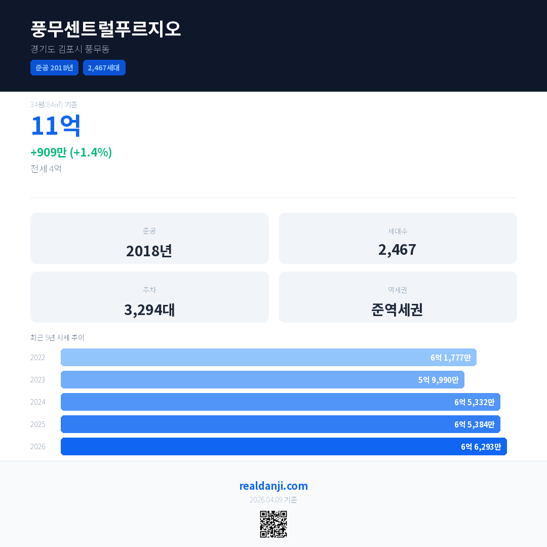풍무센트럴푸르지오 최근 거래가는 11억입니다. (2026-03)