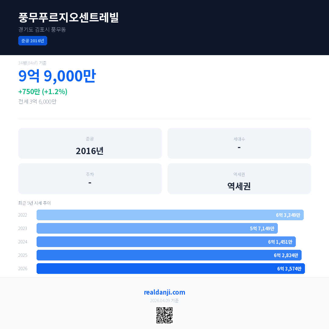 풍무푸르지오센트레빌 최근 거래가는 9억 9,000만입니다. (2026-04)