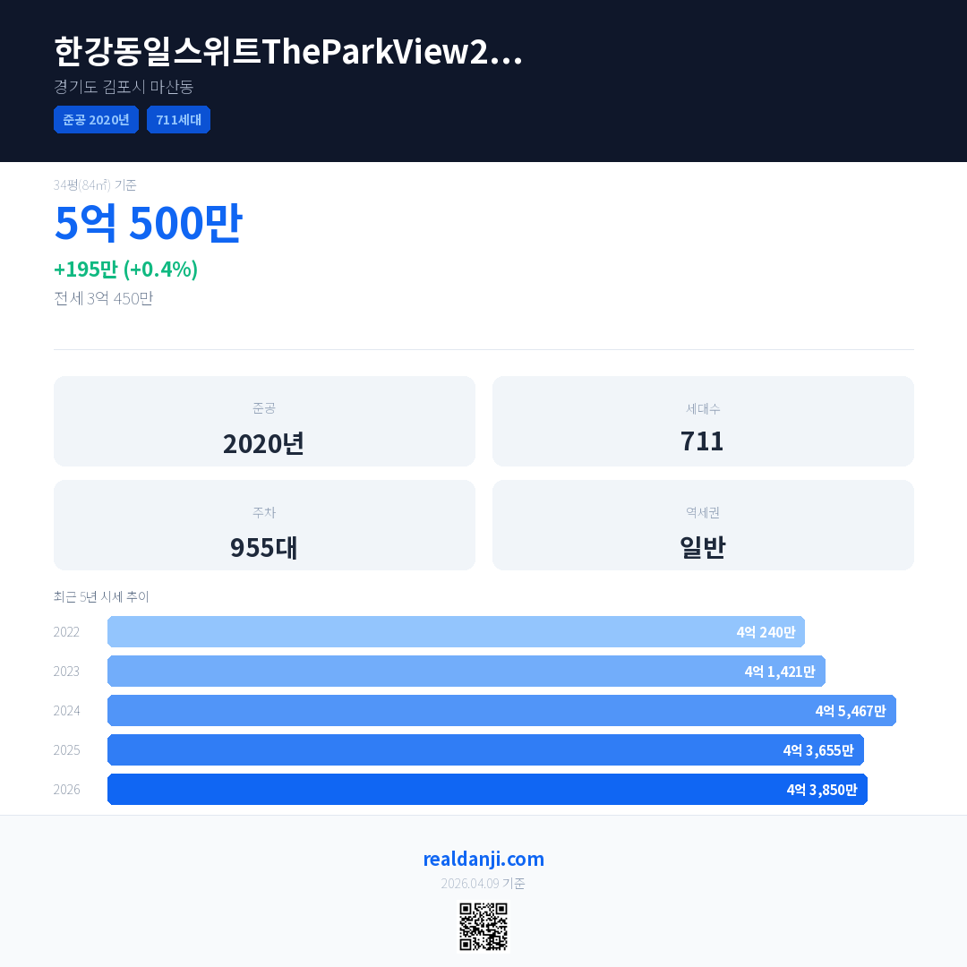 한강동일스위트TheParkView2단지 최근 거래가는 5억 500만입니다. (2026-03)