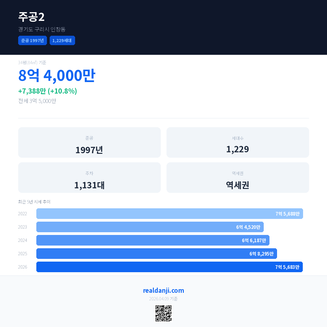 주공2 국민평형 기준 2026년 평균 거래가는 7억 5,683만으로, 전년 대비 10.8% 상승 했습니다.