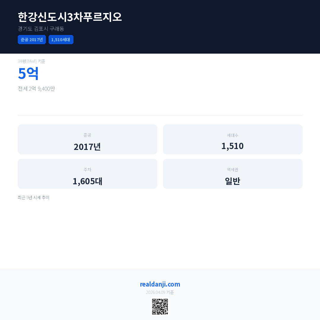 한강신도시3차푸르지오은(는) 2017년에 준공되었으며, 현재 9년차입니다. 총 1,510세대 규모입니다.