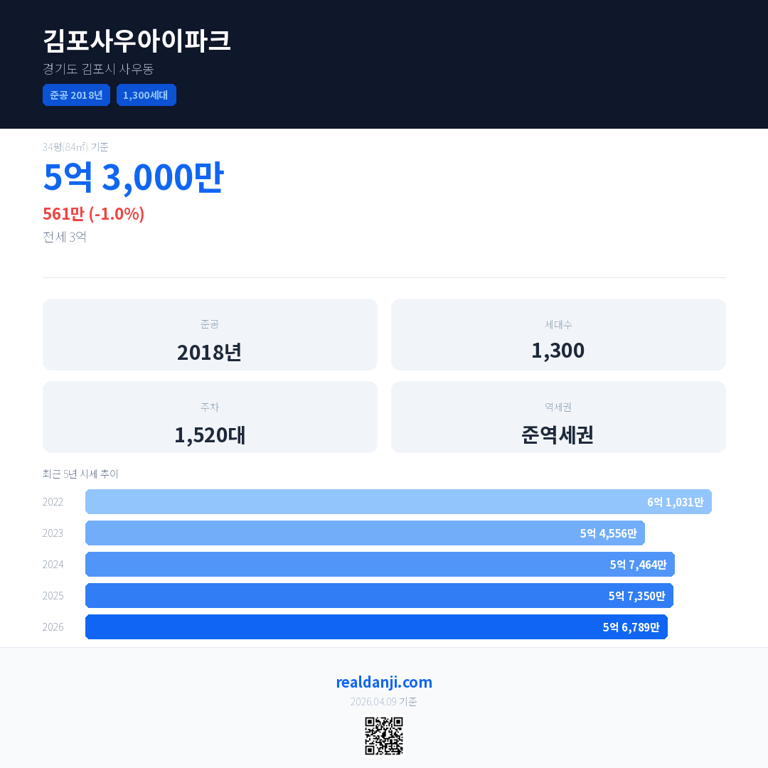 김포사우아이파크은(는) 2018년에 준공되었으며, 현재 8년차입니다. 총 1,300세대 규모입니다.