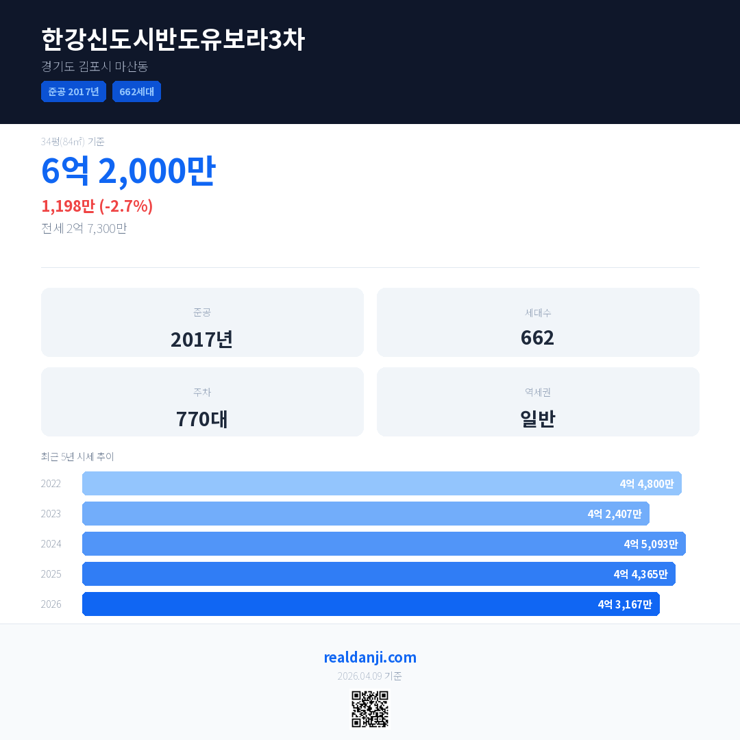 한강신도시반도유보라3차 국민평형 기준 2026년 평균 거래가는 4억 3,167만으로, 전년 대비 2.7% 하락 했습니다.