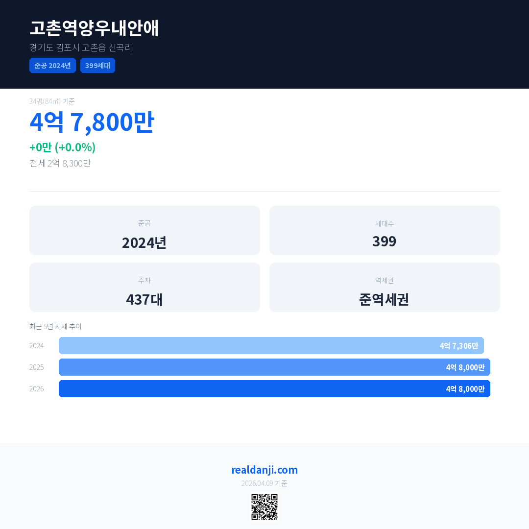 고촌역양우내안애 국민평형 기준 2026년 평균 거래가는 4억 8,000만으로, 전년 대비 0.0% 하락 했습니다.