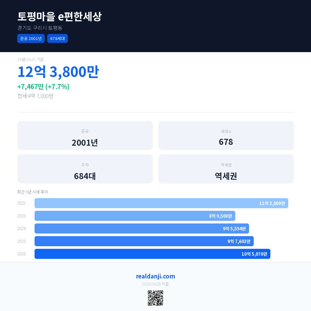 토평마을 e편한세상 국민평형 기준 2026년 평균 거래가는 10억 5,070만으로, 전년 대비 7.7% 상승 했습니다.