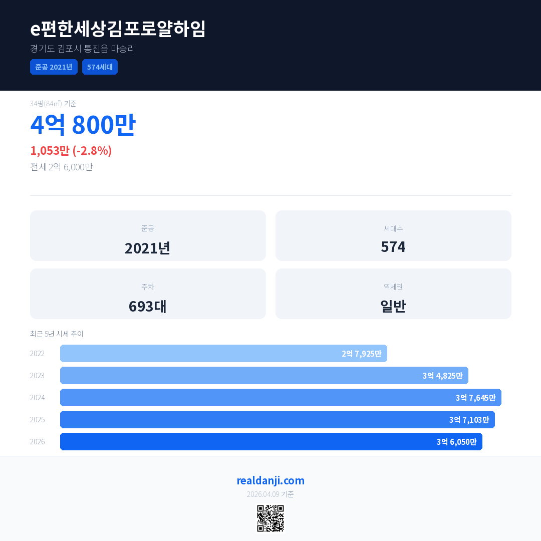 e편한세상김포로얄하임 최근 거래가는 4억 800만입니다. (2026-03)
