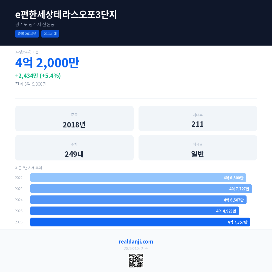e편한세상테라스오포3단지 국민평형 기준 2026년 평균 거래가는 4억 7,357만으로, 전년 대비 5.4% 상승 했습니다.