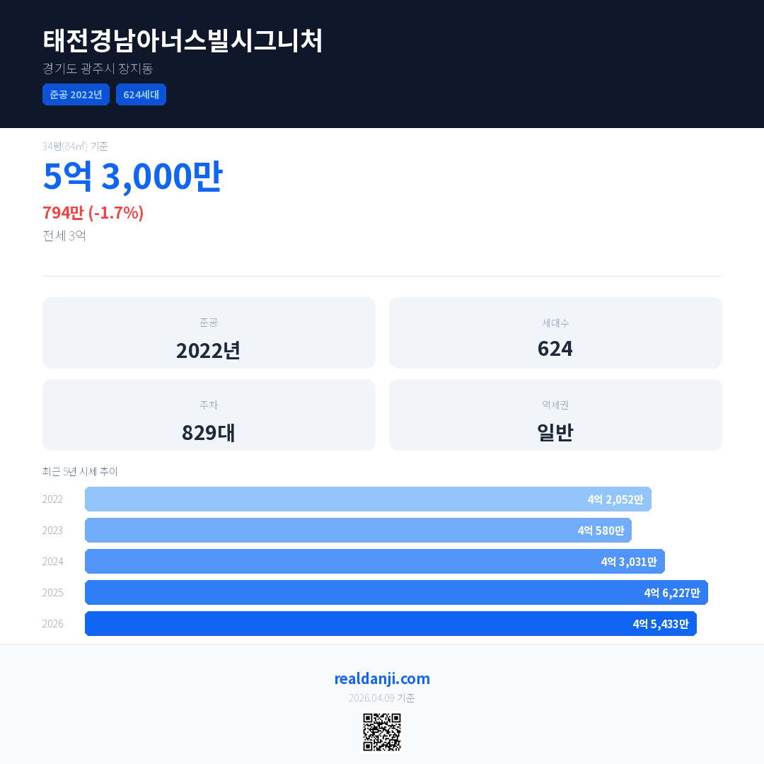 태전경남아너스빌시그니처 국민평형 기준 2026년 평균 거래가는 4억 5,433만으로, 전년 대비 1.7% 하락 했습니다.