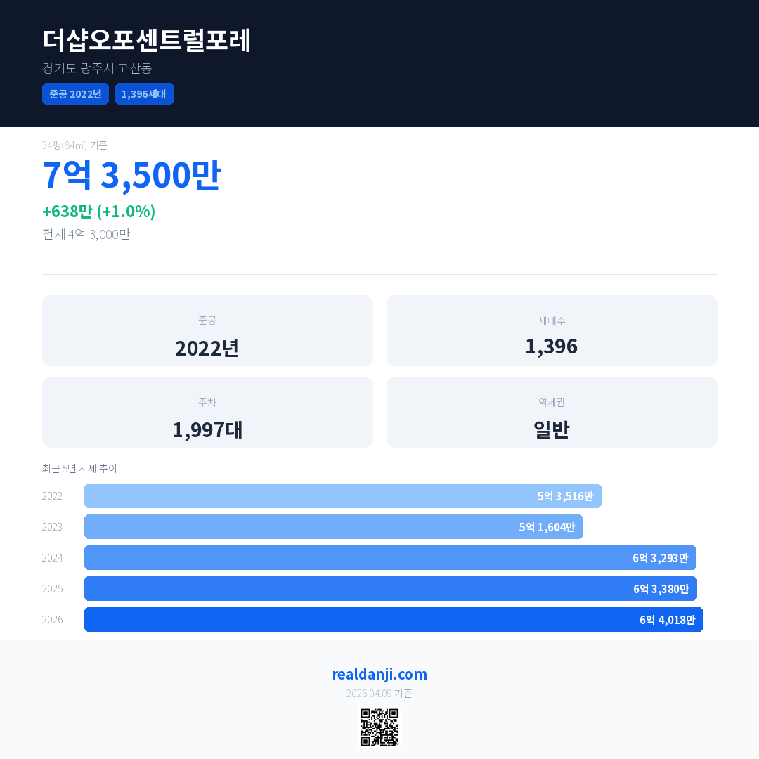 더샵오포센트럴포레 국민평형 기준 2026년 평균 거래가는 6억 4,018만으로, 전년 대비 1.0% 상승 했습니다.