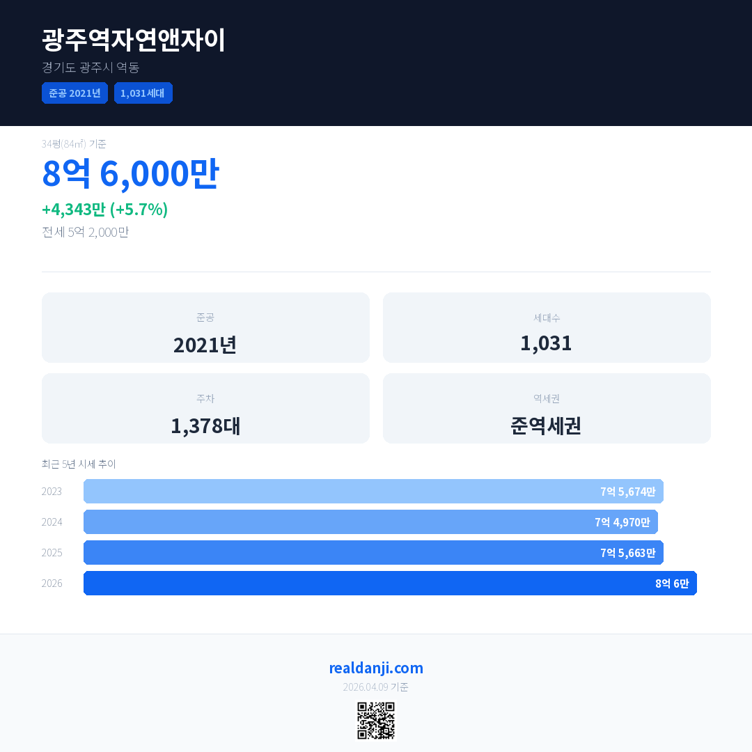 광주역자연앤자이 국민평형 기준 2026년 평균 거래가는 8억 6만으로, 전년 대비 5.7% 상승 했습니다.