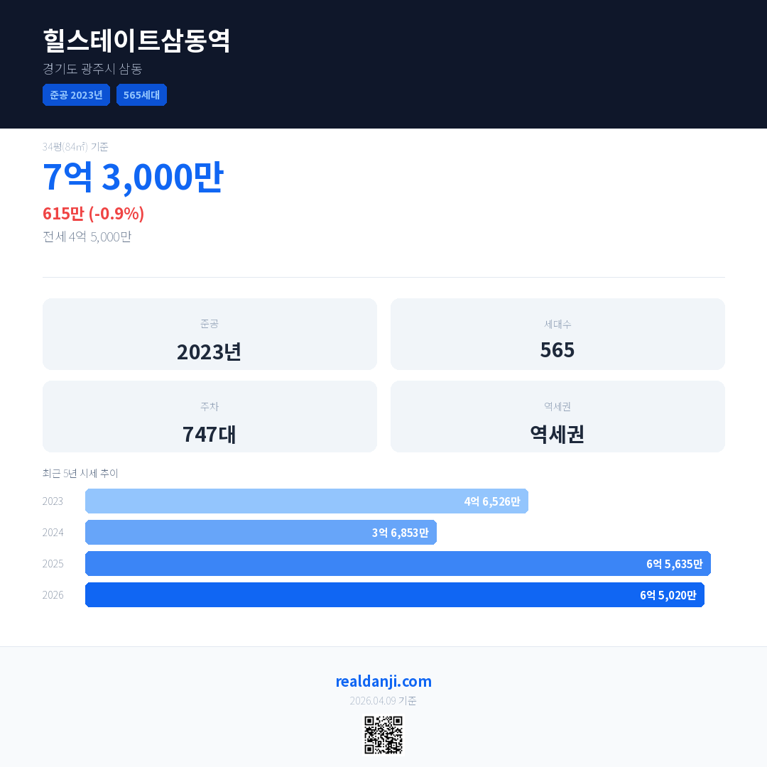 힐스테이트삼동역 최근 거래가는 7억 3,000만입니다. (2026-03)
