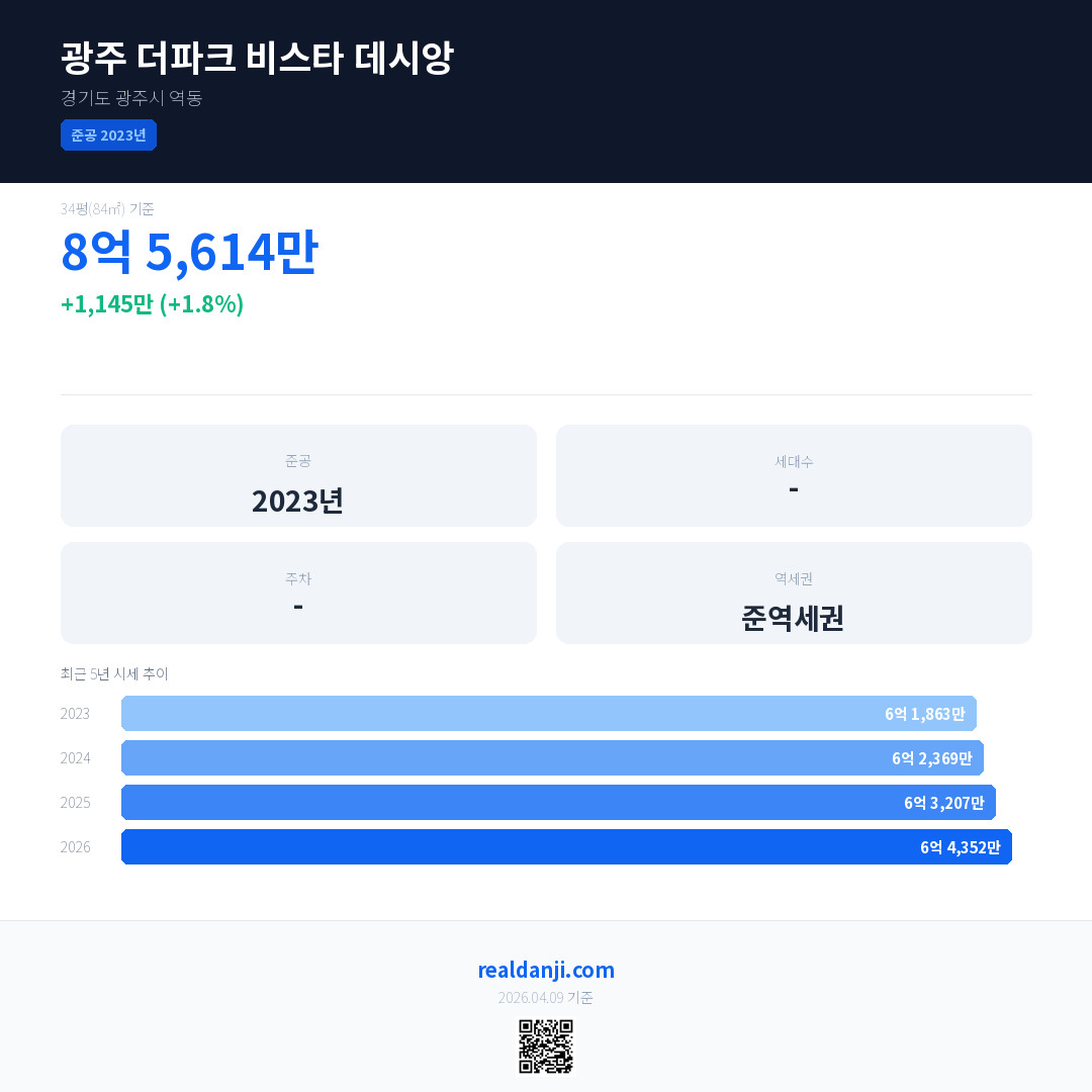 광주 더파크 비스타 데시앙 최근 거래가는 8억 8,401만입니다. (2026-04)