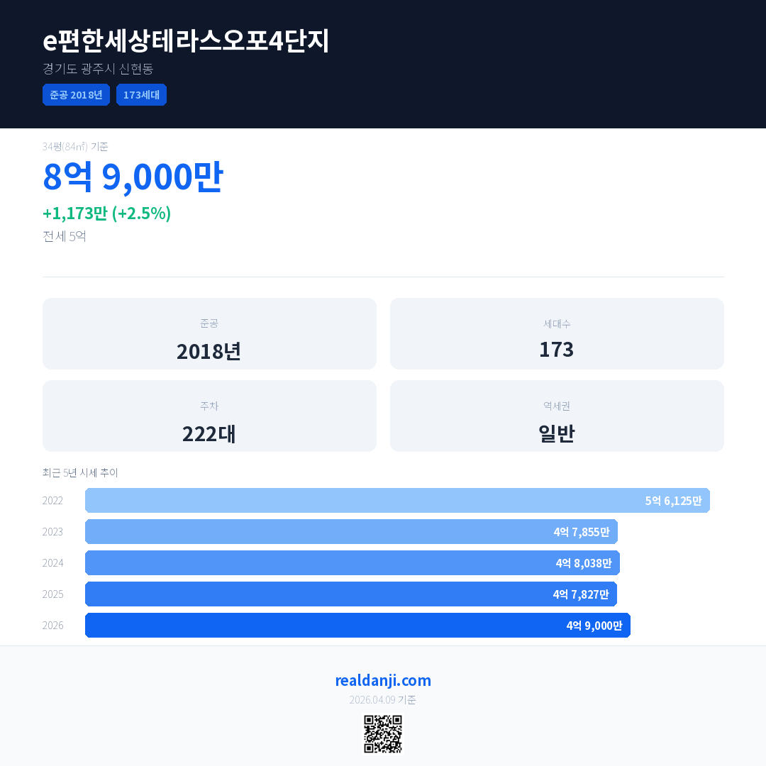 e편한세상테라스오포4단지은(는) 2018년에 준공되었으며, 현재 8년차입니다. 총 173세대 규모입니다.