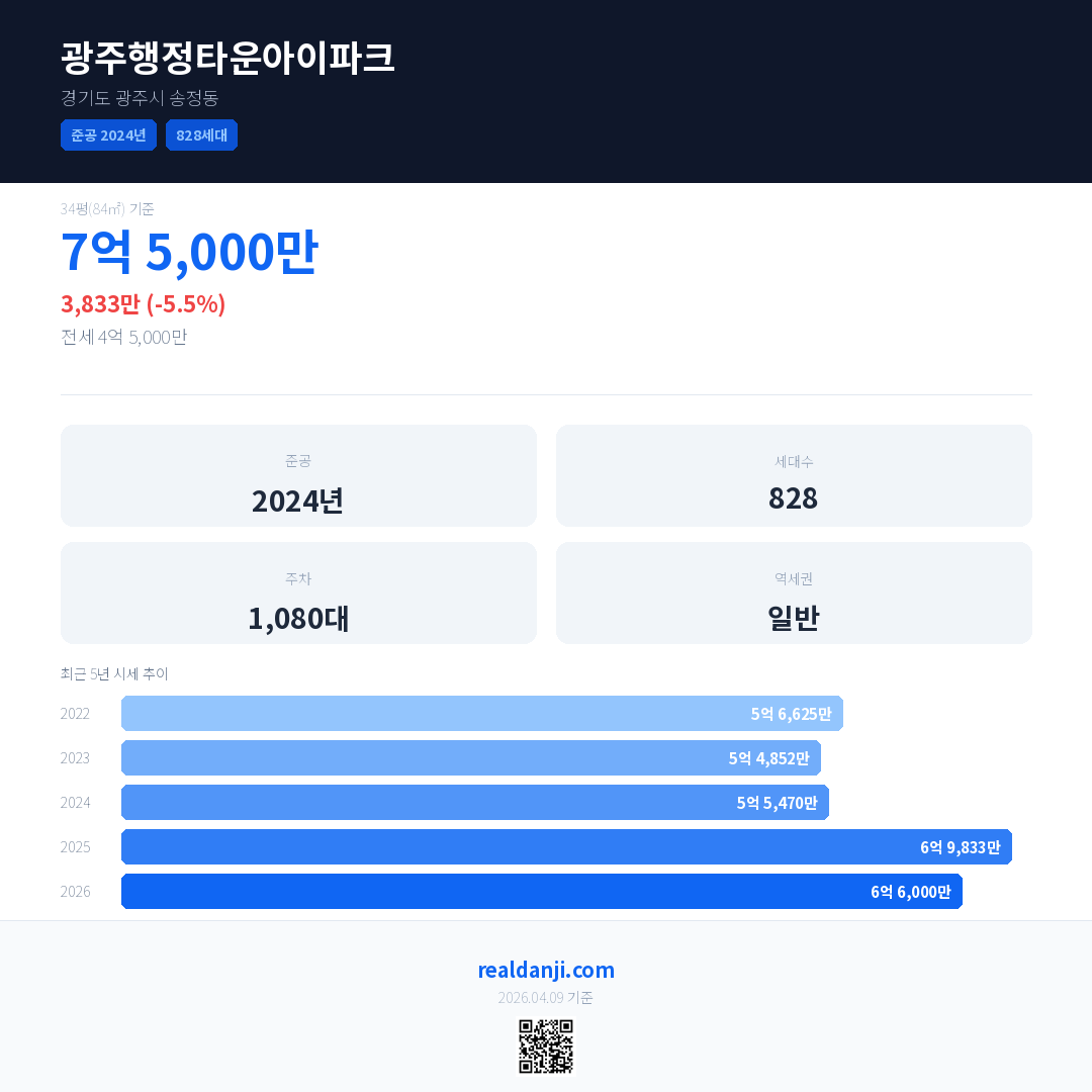 광주행정타운아이파크 최근 거래가는 7억 5,000만입니다. (2026-03)