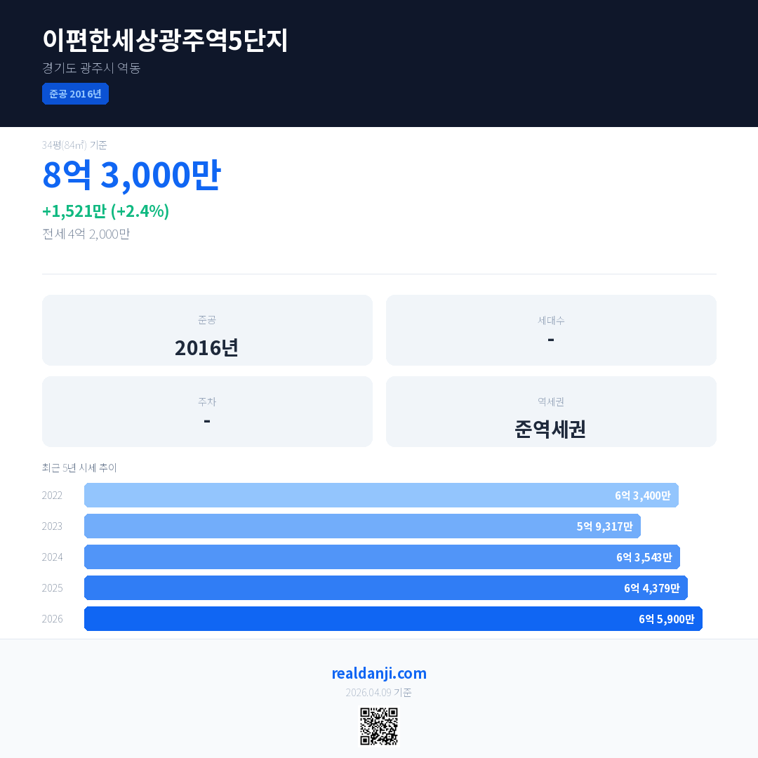 이편한세상광주역5단지 국민평형 기준 2026년 평균 거래가는 6억 5,900만으로, 전년 대비 2.4% 상승 했습니다.