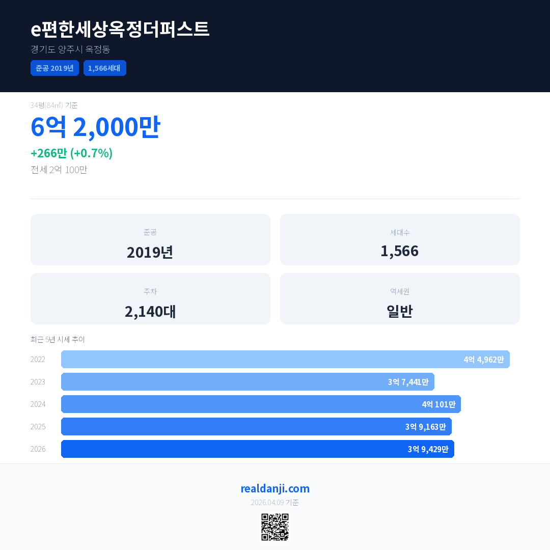 e편한세상옥정더퍼스트 국민평형 기준 2026년 평균 거래가는 3억 9,429만으로, 전년 대비 0.7% 상승 했습니다.