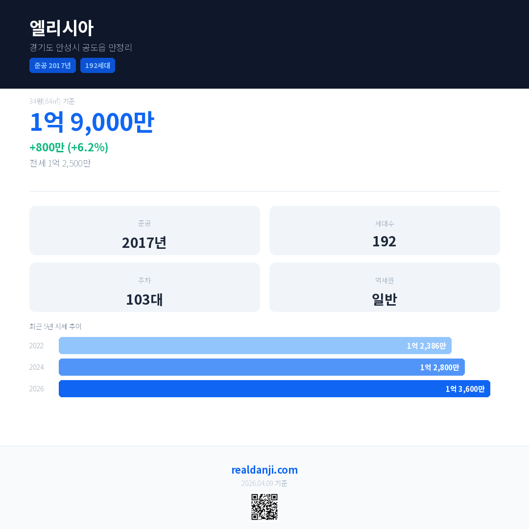 엘리시아 국민평형 기준 2026년 평균 거래가는 1억 3,600만으로, 전년 대비 6.2% 상승 했습니다.