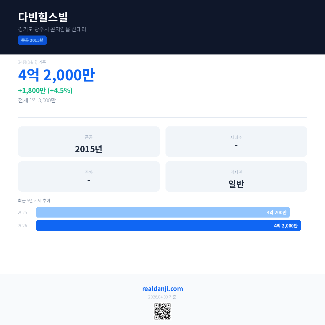 다빈힐스빌 국민평형 기준 2026년 평균 거래가는 4억 2,000만으로, 전년 대비 4.5% 상승 했습니다.