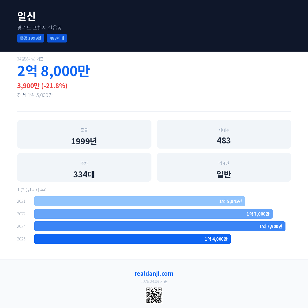 일신 국민평형 기준 2026년 평균 거래가는 1억 4,000만으로, 전년 대비 21.8% 하락 했습니다.