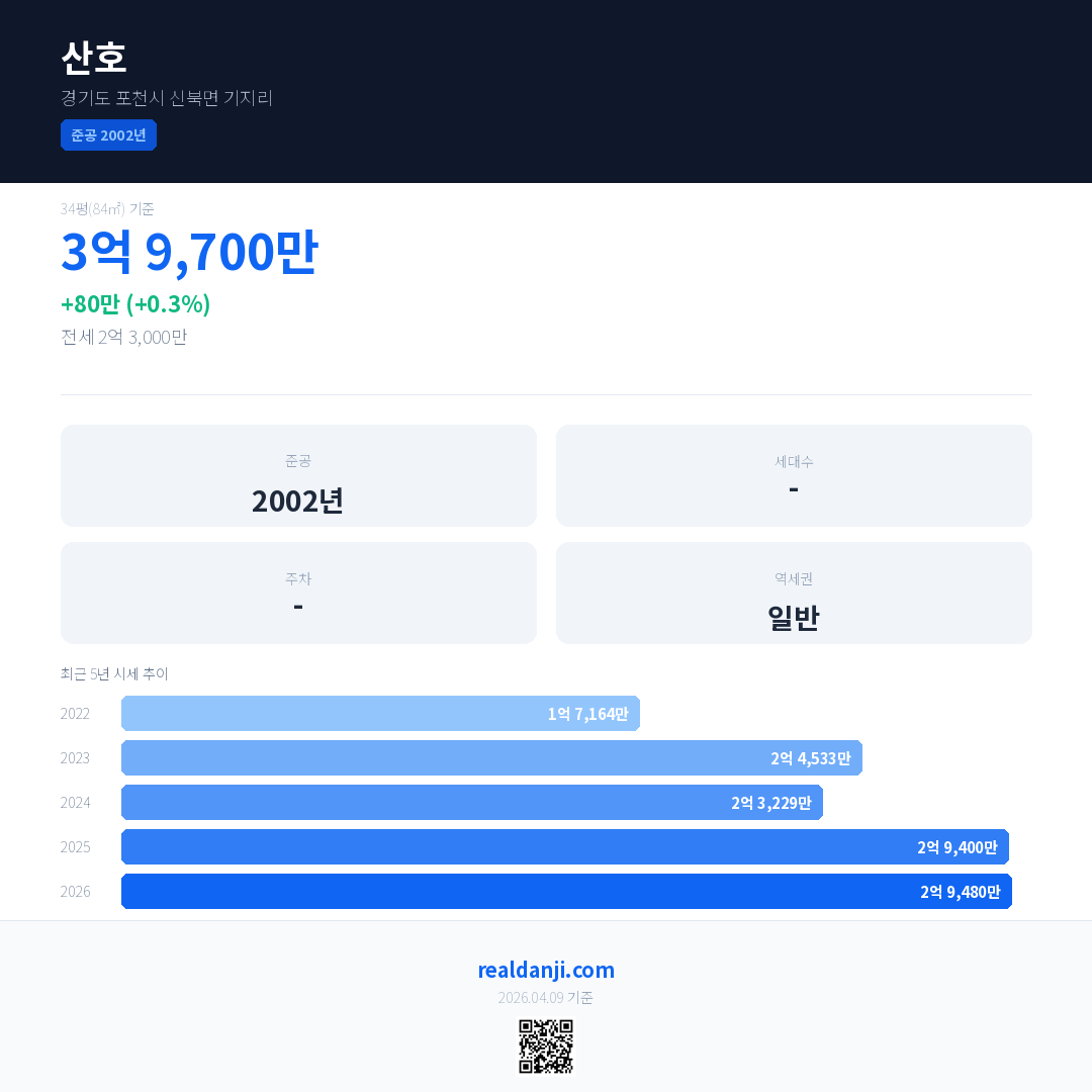 산호 국민평형 기준 2026년 평균 거래가는 2억 9,480만으로, 전년 대비 0.3% 상승 했습니다.