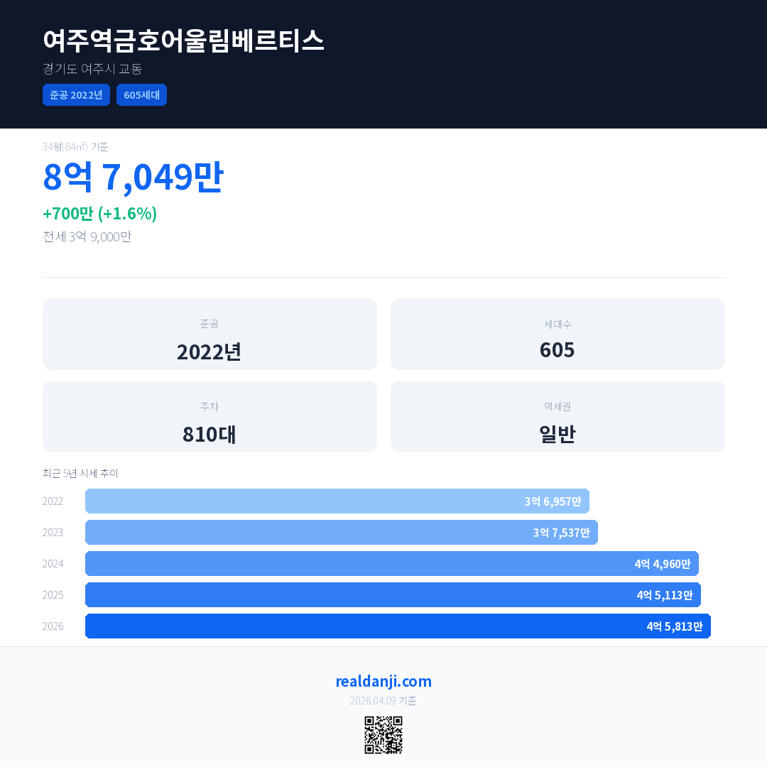 여주역금호어울림베르티스 국민평형 기준 2026년 평균 거래가는 4억 5,813만으로, 전년 대비 1.6% 상승 했습니다.