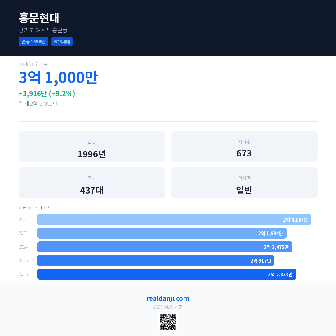 홍문현대 국민평형 기준 2026년 평균 거래가는 2억 2,833만으로, 전년 대비 9.2% 상승 했습니다.