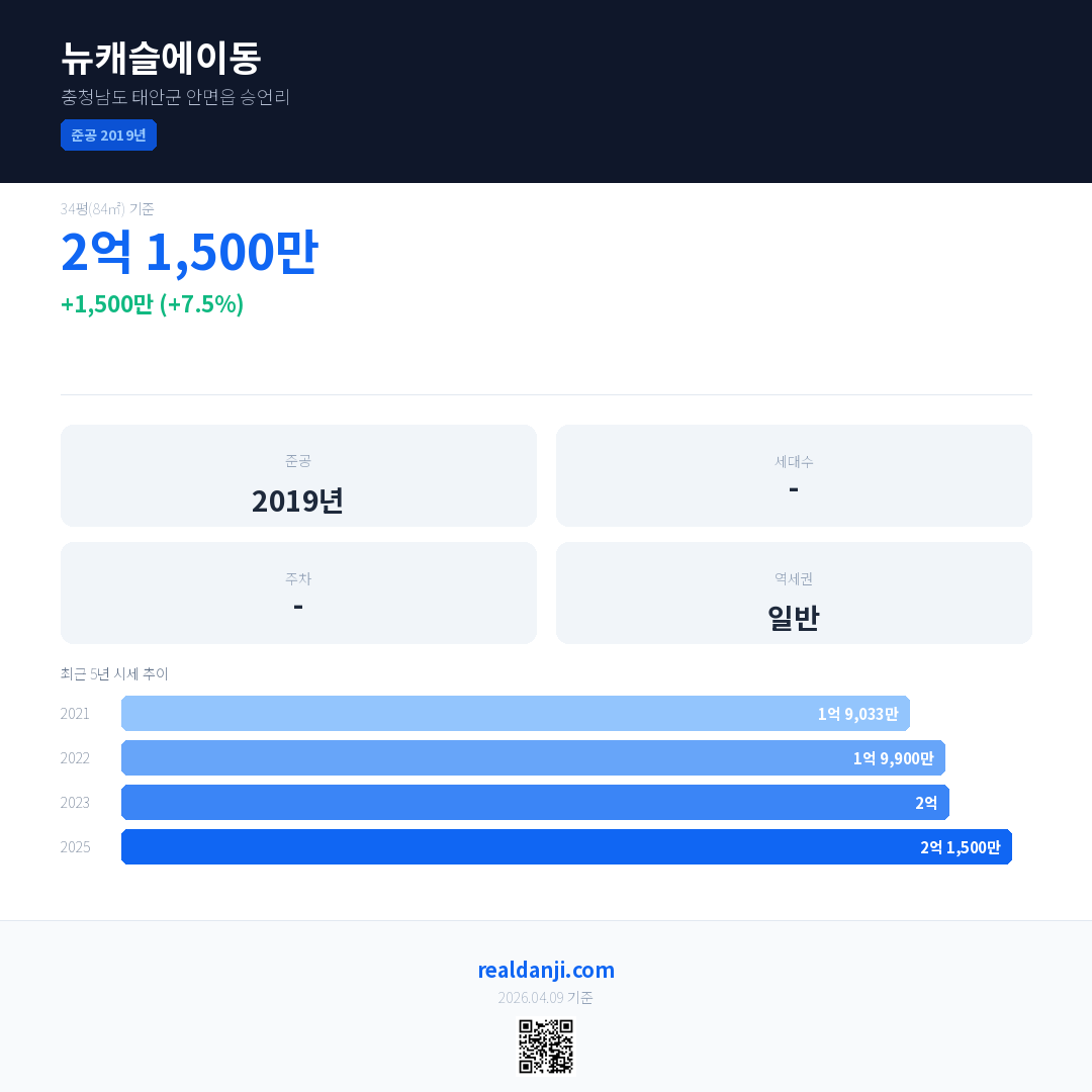뉴캐슬에이동 국민평형 기준 2025년 평균 거래가는 2억 1,500만으로, 전년 대비 7.5% 상승 했습니다.