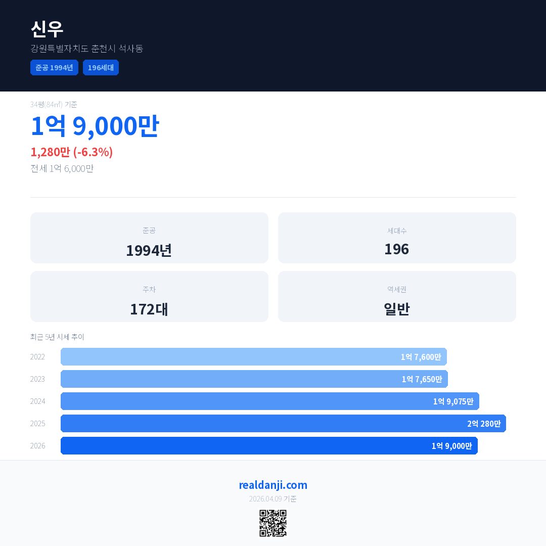 신우 국민평형 기준 2026년 평균 거래가는 1억 9,000만으로, 전년 대비 6.3% 하락 했습니다.