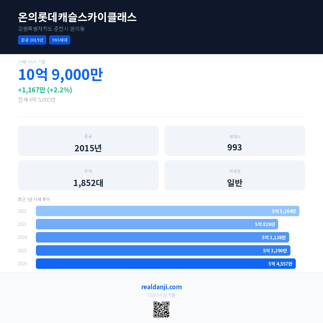 온의롯데캐슬스카이클래스 국민평형 기준 2026년 평균 거래가는 5억 4,557만으로, 전년 대비 2.2% 상승 했습니다.