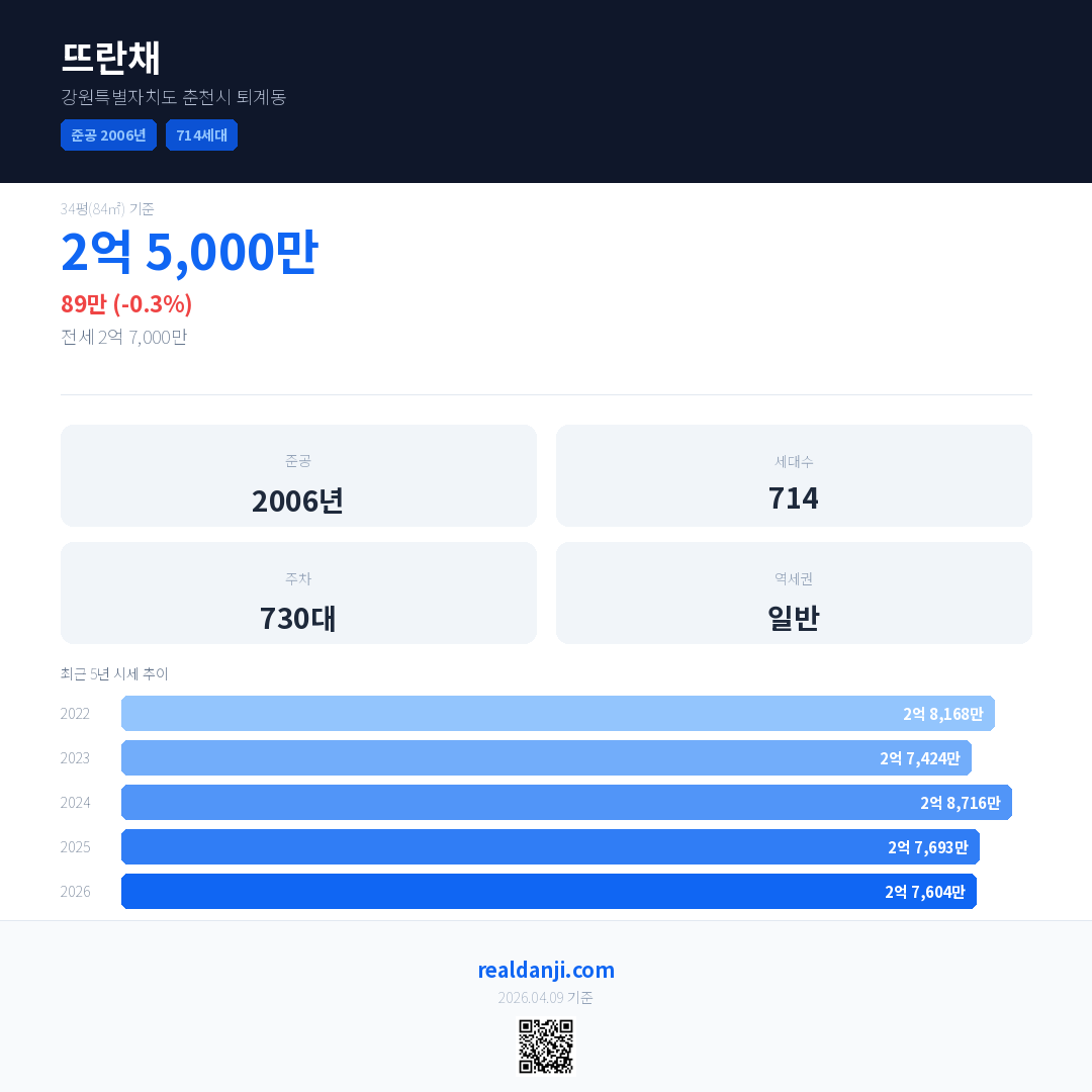 뜨란채 국민평형 기준 2026년 평균 거래가는 2억 7,604만으로, 전년 대비 0.3% 하락 했습니다.
