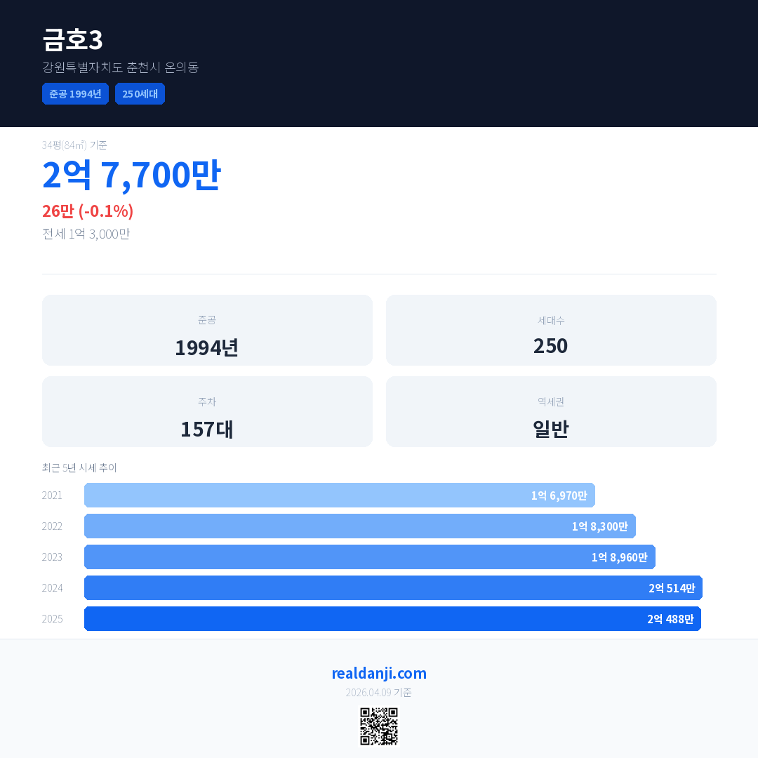 금호3 국민평형 기준 2025년 평균 거래가는 2억 488만으로, 전년 대비 0.1% 하락 했습니다.