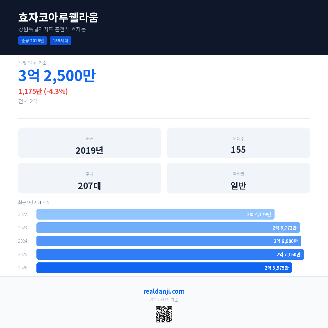 효자코아루웰라움 국민평형 기준 2026년 평균 거래가는 2억 5,975만으로, 전년 대비 4.3% 하락 했습니다.